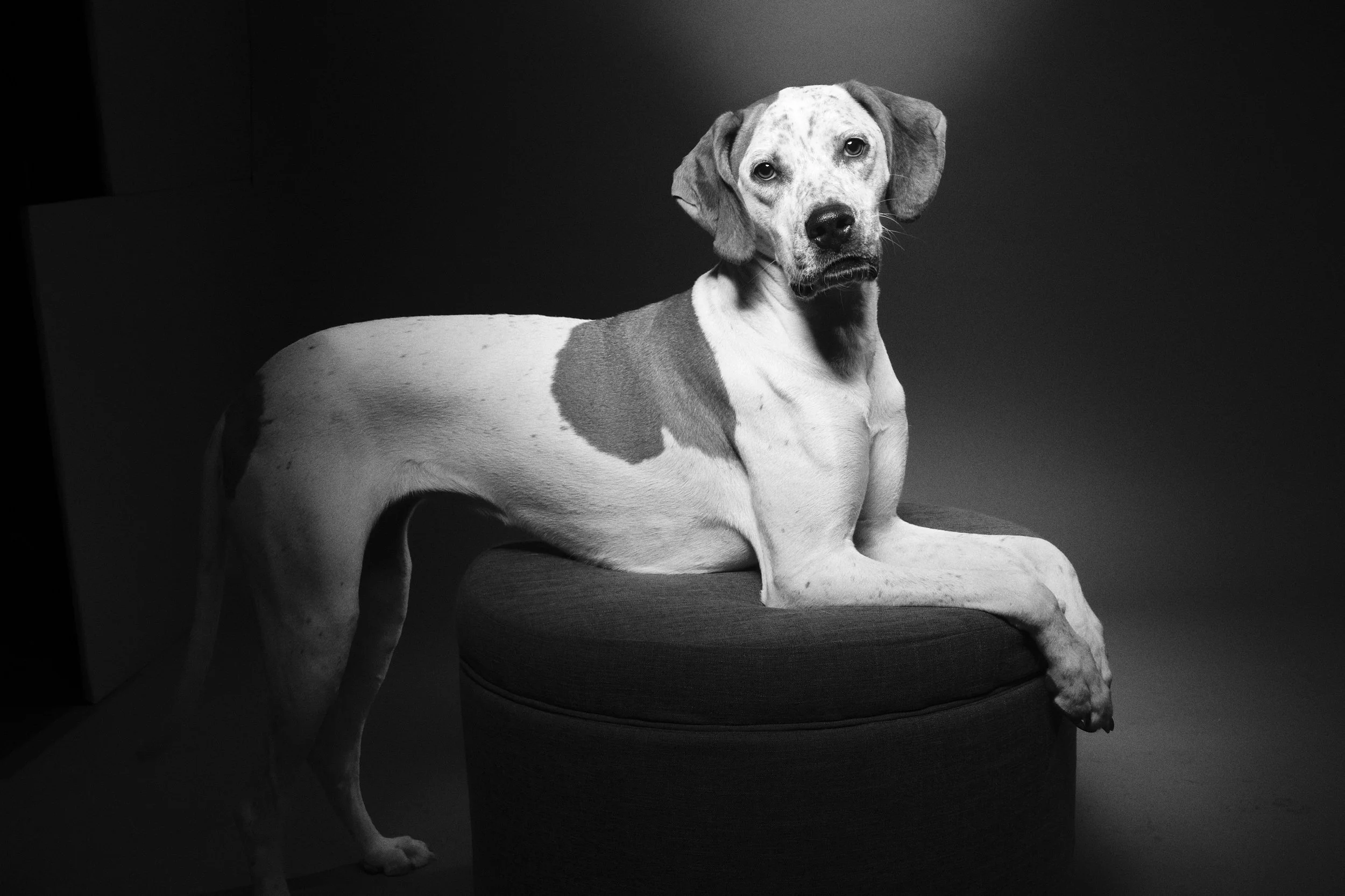 Moti is a very high energy, expressive dog. During the session, I got all her moods - goofy, alert, pensive — and I had to be attentive and quick to capture them because she rotated through them in lightening speed. At one point we were having her sit up on an ottoman and during one go around Moti decided to just lay her front legs across the ottoman with her back legs still standing beside it. There was something about that “pose” that looked interesting and since Moti did that behavior on her own I wanted to follow it through. I took some shots in both landscape and portrait orientations. I got some nice ones and then we moved onto some different poses.